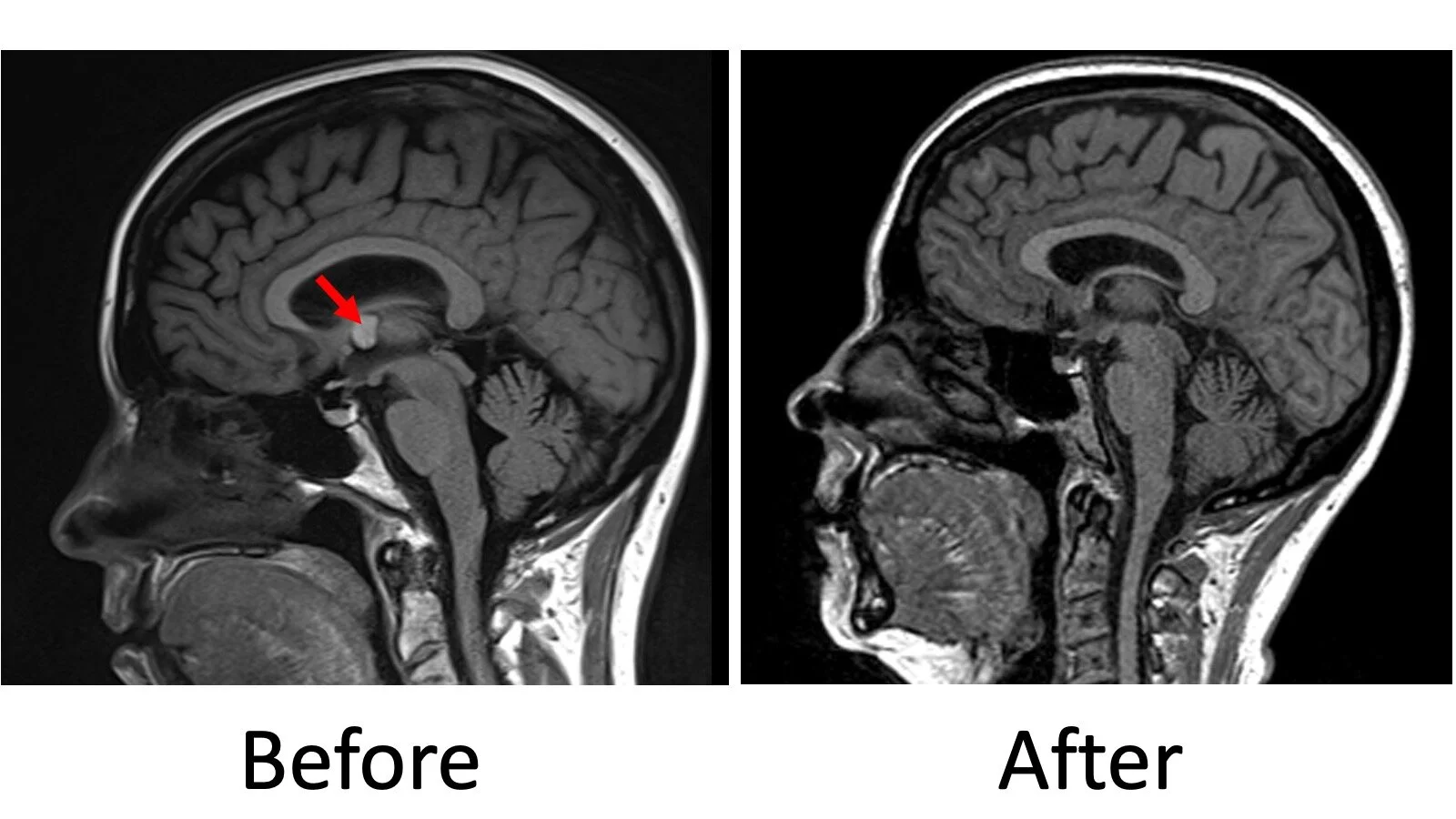 Before and after endoscopic removal of a colloid cyst (red arrow).